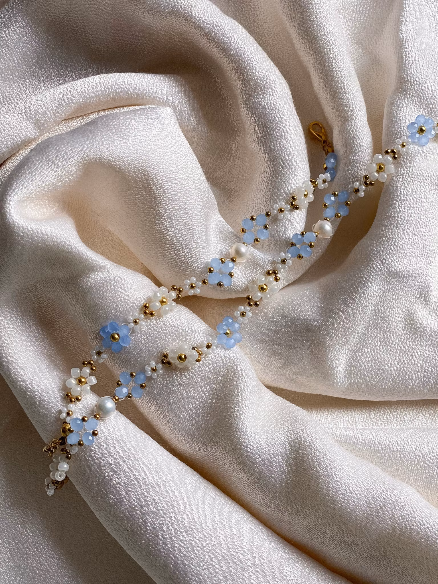 Dette smukke sæt i blå og hvide nuancer er skabt med ægte ferskvandsperler og fine glasperler, som sammen danner en unik og sofistikeret kombination. Detaljerne er omhyggeligt udvalgt, og lås, kæde samt de delikate Miyuki guldperler er belagt med slidstærkt 18 karat guldbelægning. Perfekt til enhver lejlighed, hvor du ønsker at tilføje et strejf af luksus og femininitet til dit look.